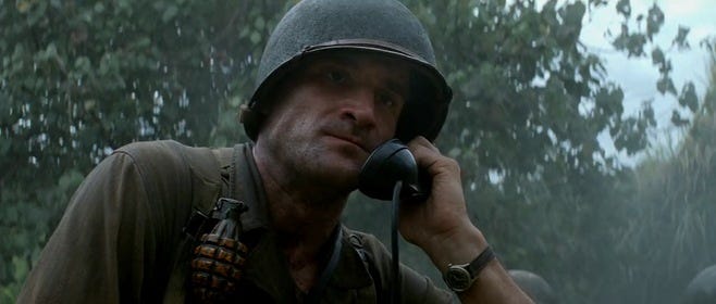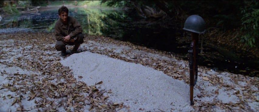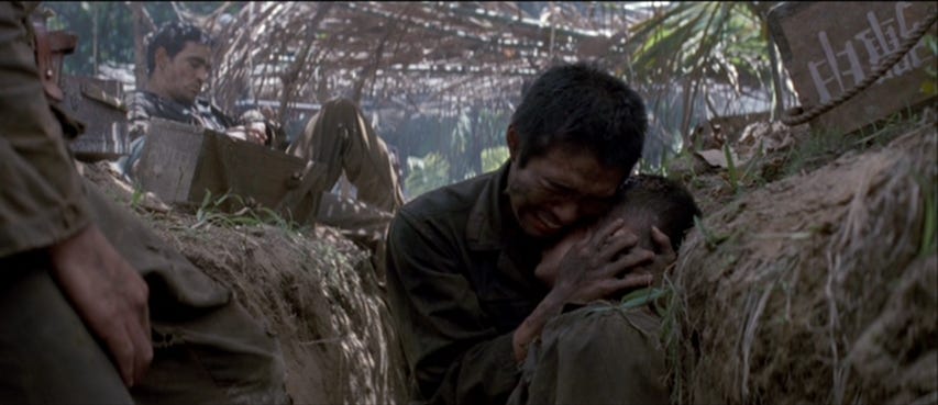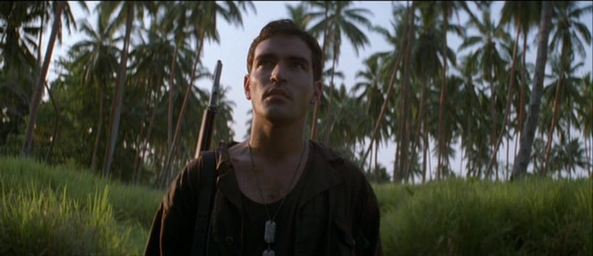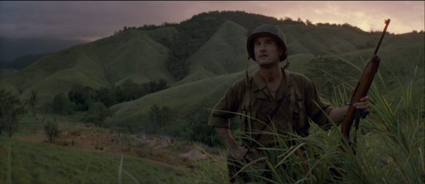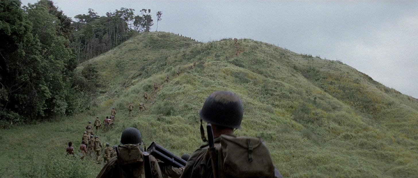 The next battle scene is pivotal close-range combat with many rifle fires and bayonets. It’s a brutal scene with both sides committing atrocities. You don’t care who wins in these moments because everything is horrific. You don’t care that the US is winning. It's a paradoxical and conflicting scene as the US soldiers hold the Japanese soldiers’ lives in their hands with the ability to end it. Pvt. Train philosophizes in his head as he witnesses these horrors: