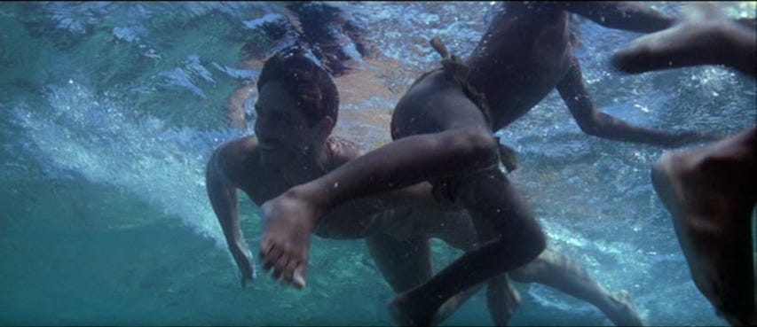 After this, Malick brings us back to the beginning when Pvt. Witt is swimming with a group of young indigenous boys as tribal music is played. It’s a quick flashback to remind us of the peace he once had.