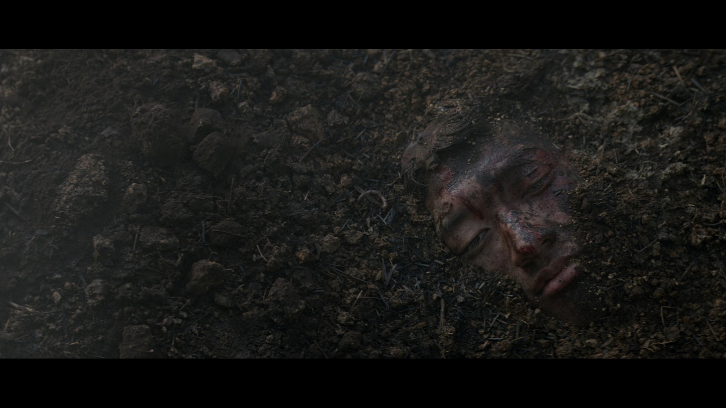 There is another scene where moral philosophies clash. The Lt. Col. refuses to give the men water to keep the momentum of the battle going. Everyone is morally and physically exhausted. The soldiers are being barked orders as they stare at the ruins of a village leveled by artillery fire. In a haunting moment, Cpl. Fife sees the face of a dead Japanese man buried under dirt. Cpl. Fife hears him say,